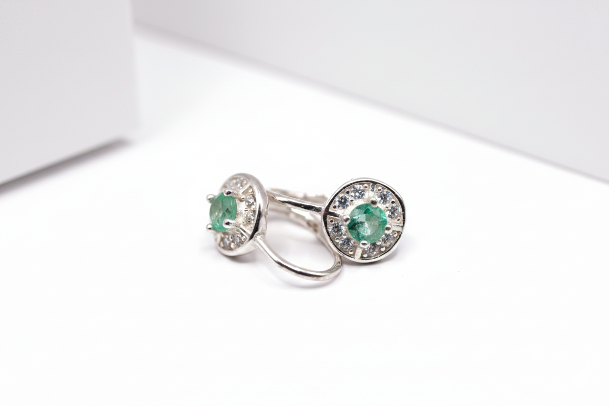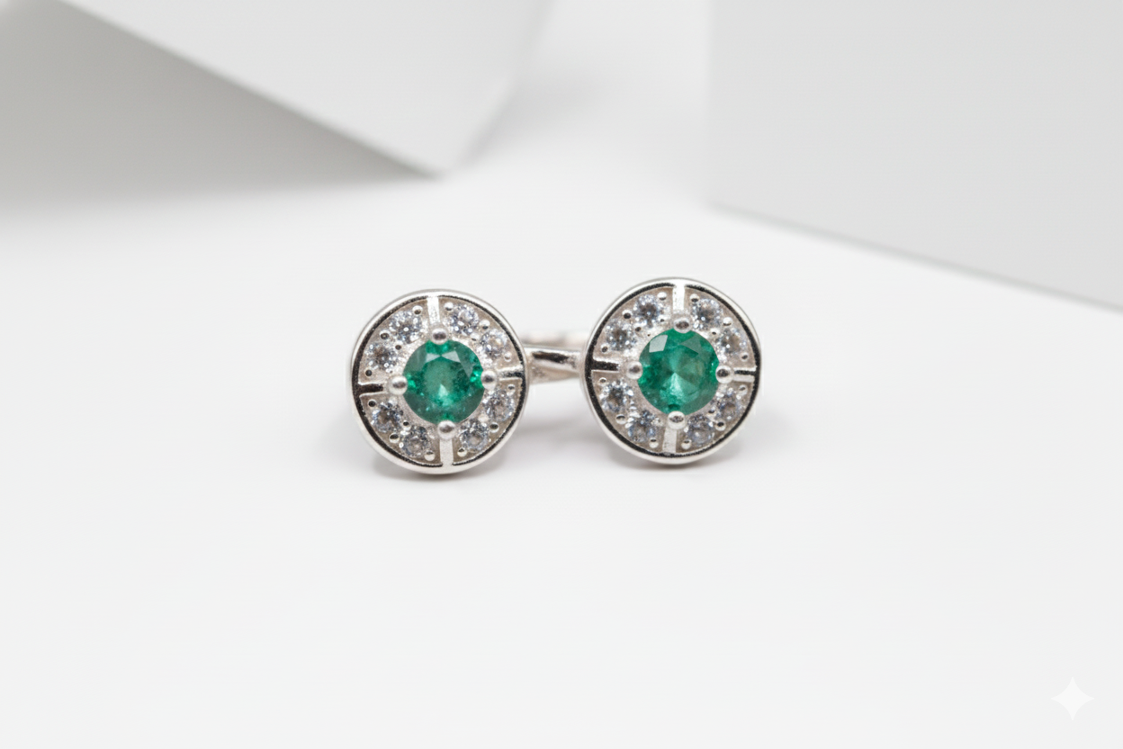 Elaborados en plata ley 925 y engastados con esmeraldas colombianas genuinas rodeadas de circones, su diseño elegante evoca equilibrio, lujo y distinción. Cada detalle refleja precisión artesanal y la belleza única de una joya auténtica.