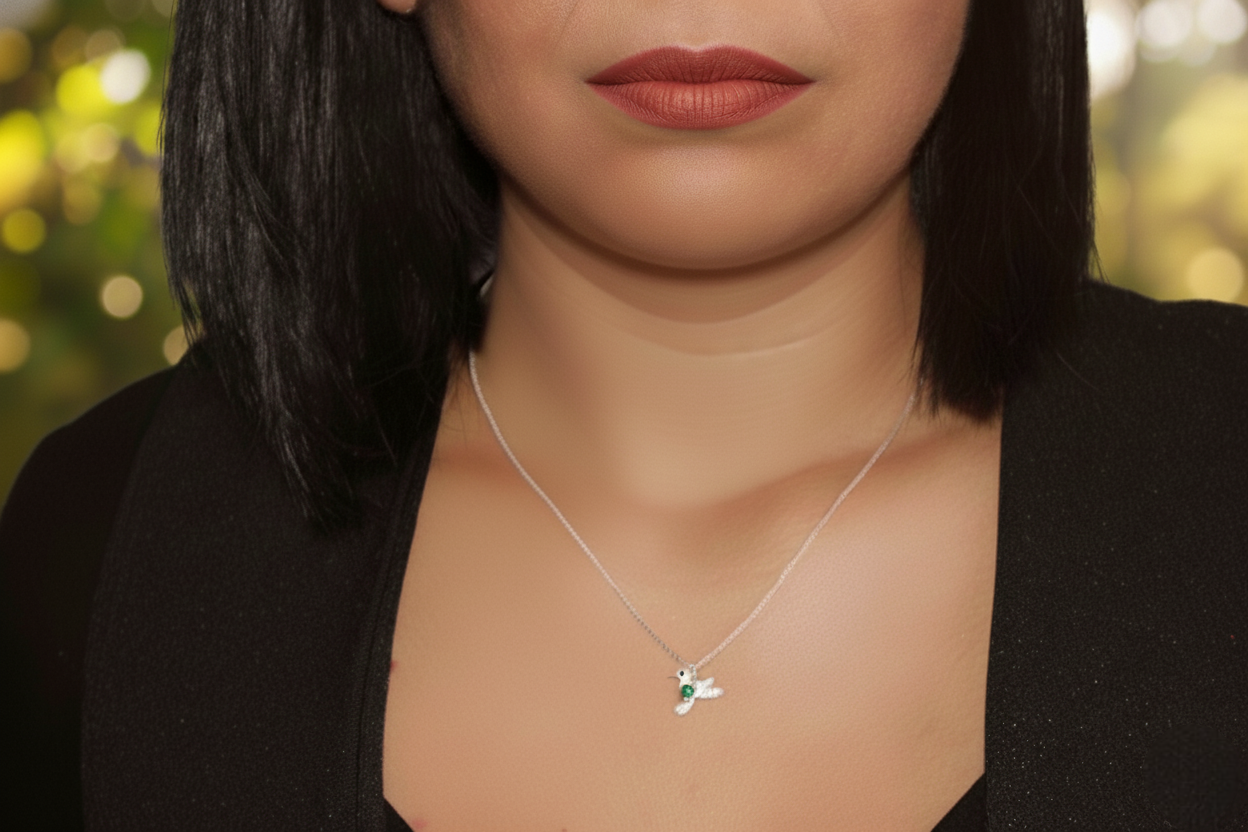 Collar colibrí con esmeralda natural – una joya que encarna libertad, pureza y elegancia.