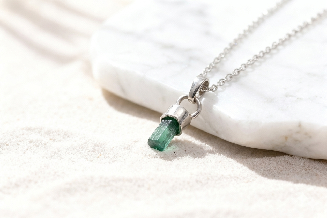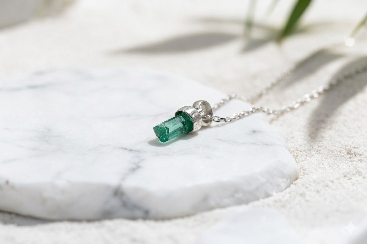 Este dije canutillo con esmeralda natural resalta la belleza auténtica de la piedra en su forma más natural. Su corte cilíndrico conserva el carácter orgánico de la esmeralda, mostrando sus vetas y tonalidades verdes únicas.